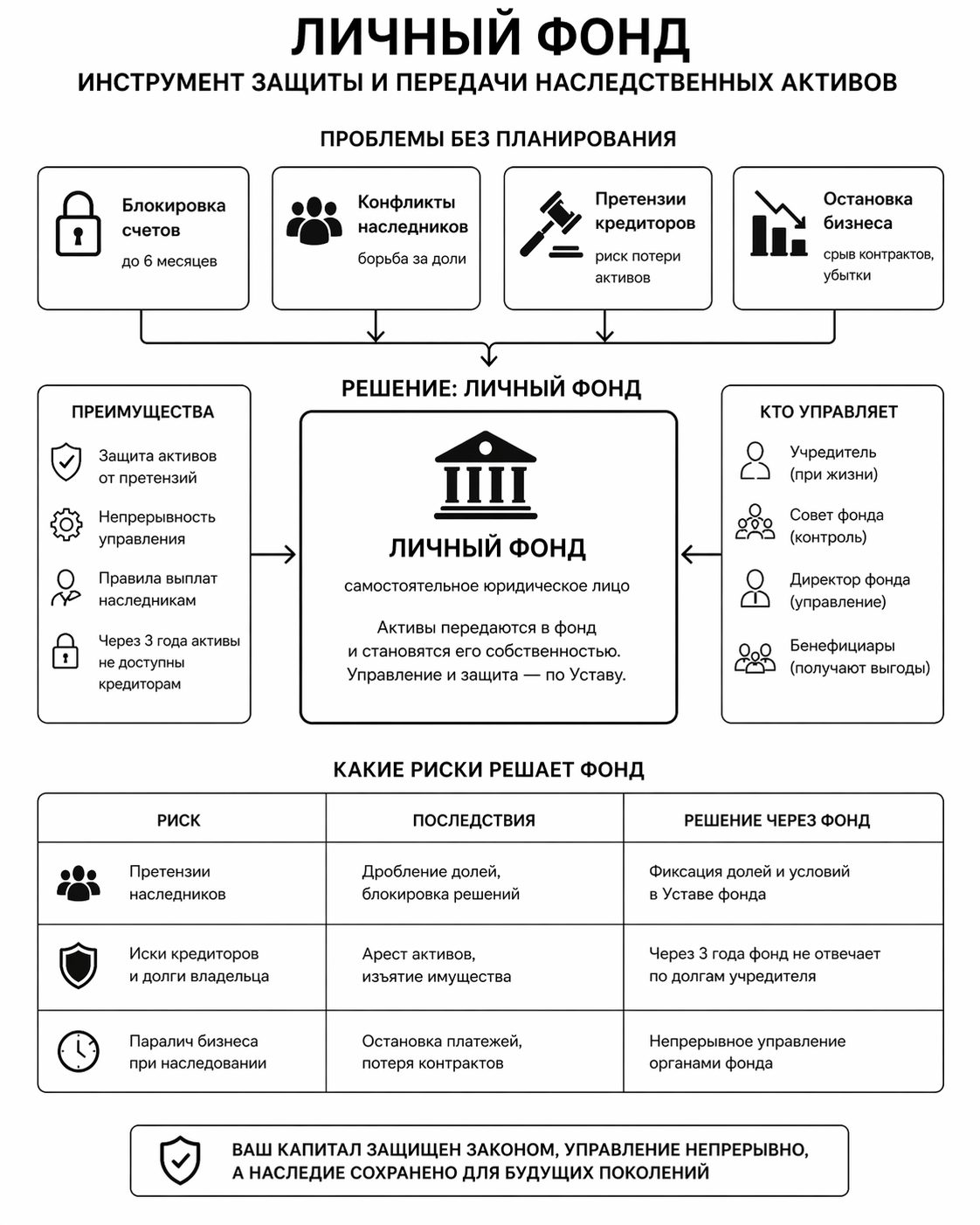 Мое решение для таких случаев — внедрение структуры, которая работает автономно и предсказуемо. Личный фонд сегодня стал той самой структурой, которая позволяет перевести бизнес-активы под профессиональное управление, сохранив их целостность для следующих поколений. Это не просто юридическая оболочка, это способ «зацементировать» вашу волю так, чтобы ее не смогли оспорить или проигнорировать.